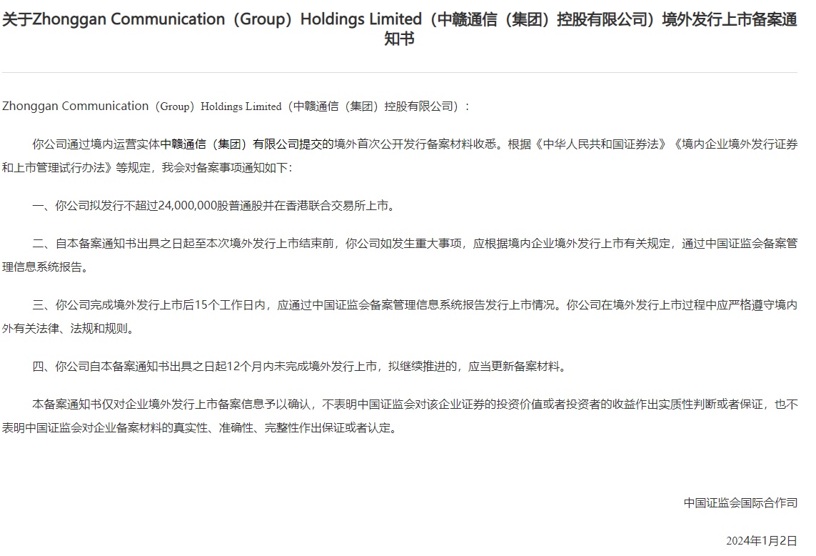 智通财经APP获悉,1月2日,中国证监会发布《关于Zhonggan Communication(Group)Holdings Limited(中赣通信(集团)控股有限公司)境外发行上市备案通知书》。该公司拟发行不超过24,000,000股普通股并在香港联合交易所上市。据悉,2023年6月30日,中赣通信向港交所递交上市申请,中泰国际为独家保荐人。