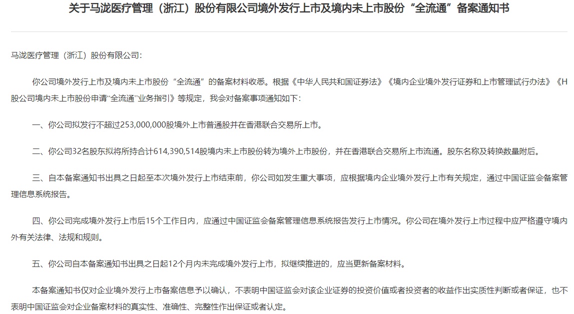 智通财经APP获悉,1月2日,中国证监会发布关于马泷医疗管理(浙江)股份有限公司境外发行上市及境内未上市股份“全流通”备案通知书,公司拟发行不超过253000000股境外上市普通股并在香港联合交易所上市,公司32名股东拟将所持合计614390514股境内未上市股份转为境外上市股份,并在香港联合交易所上市流通。
