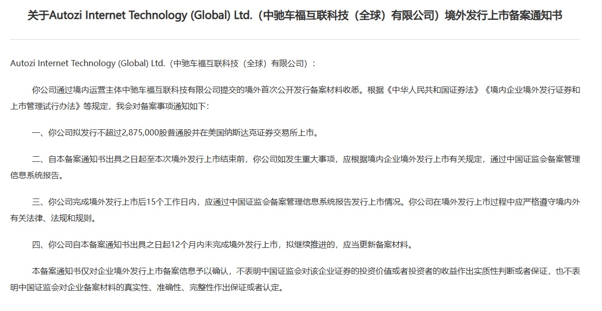 Ltd.(中驰车福互联科技(全球)有限公司)境外发行上市备案通知书,该公司拟发行不超过2,875,000股普通股并在美国纳斯达克证券交易所上市,股票代码为“AZI”。