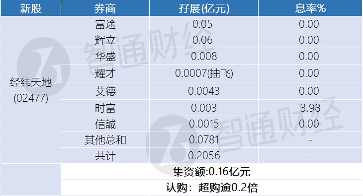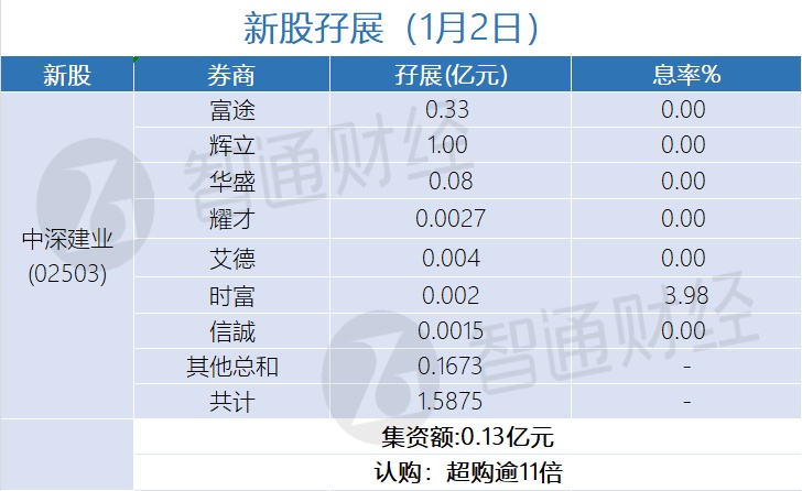 智通财经APP获悉,中深建业(02503)、经纬天地(02477)正在招股中。截至1月2日,辉立、时富等券商合计为中深建业借出孖展1.5875亿港元,超购逾11倍;为经纬天地借出孖展0.2056亿港元,超购逾0.2倍。