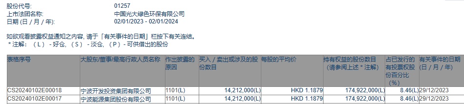 智通财经APP获悉,香港联交所最新资料显示,12月29日,宁波能源集团增持中国光大绿色环保(01257)1421.2万股,每股作价1.1879港元,总金额约为1688.24万港元。增持后最新持股数目约为1.75亿股,最新持股比例为8.46%。