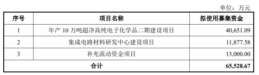招股书显示,润玛股份是国内知名的湿电子化学品专业生产商,主要面向大规模集成电路和高世代显示面板领域客户,提供以高性能蚀刻液、光刻胶剥离及清洗等配套试剂为核心的湿电子化学品。公司产品被广泛应用于集成电路晶圆制造及芯片封装、显示面板制造中的清洗、光刻、显影、蚀刻等工艺环节,是支撑集成电路、显示面板等产业发展不可或缺的关键性材料。