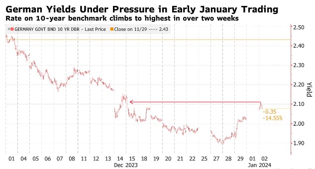 智通财经获悉,全球政府债券新年开盘谨慎,因交易员减少了对主要央行今年大幅降息的押注。德国10年期国债收益率跃升9个基点,至2.11%,为两周多以来的最高水平,而英国10年期国债收益率上升13个基点。美国国债收益率上升至少6个基点,令彭博美元现货指数有望创下近3个月来的最大单日涨幅。