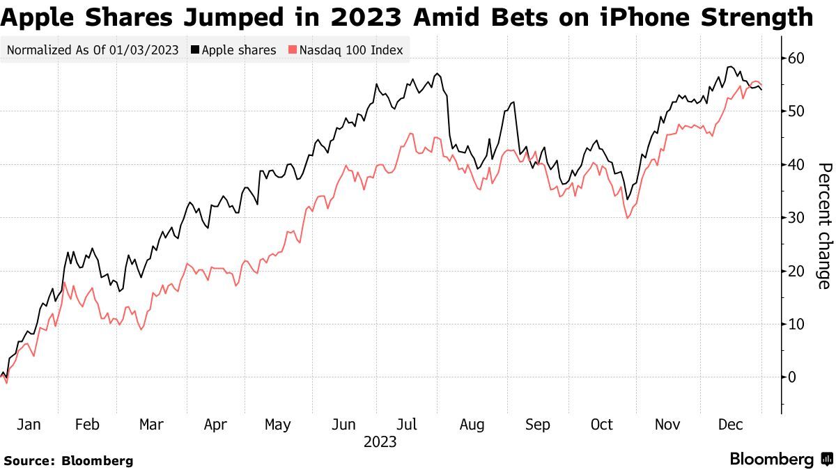 数据显示,苹果股价在2023年上涨了约50%,创下历史新高,市值达到3万亿美元,原因是投资者押注苹果的旗舰产品能够帮助其抵御经济的低迷。不过,考虑到日益激烈的竞争,人们怀疑该公司的股价能否在新的一年里再次实现如此强劲的涨幅。