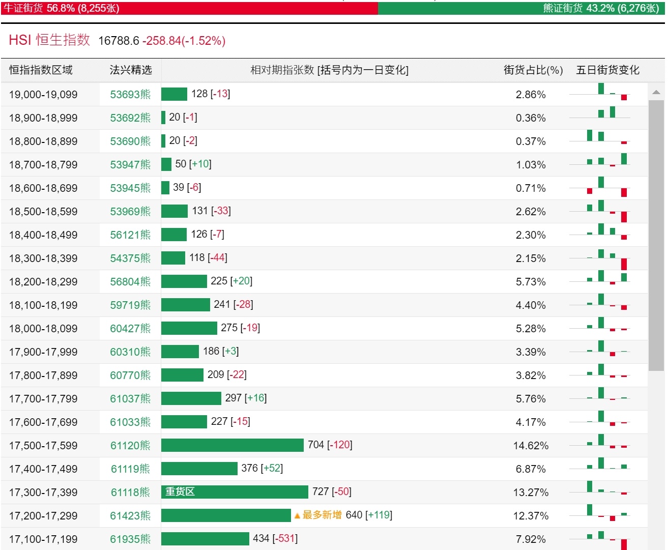 法兴恒指牛熊证街货分布图中的数据显示,熊证街货重货区在17300-17399区间,该区间最新熊证数量为727张,较上一交易日减少50张;最多新增在17200-17299区间,该区间最新熊证数量为640张,较上一交易日增加119张。