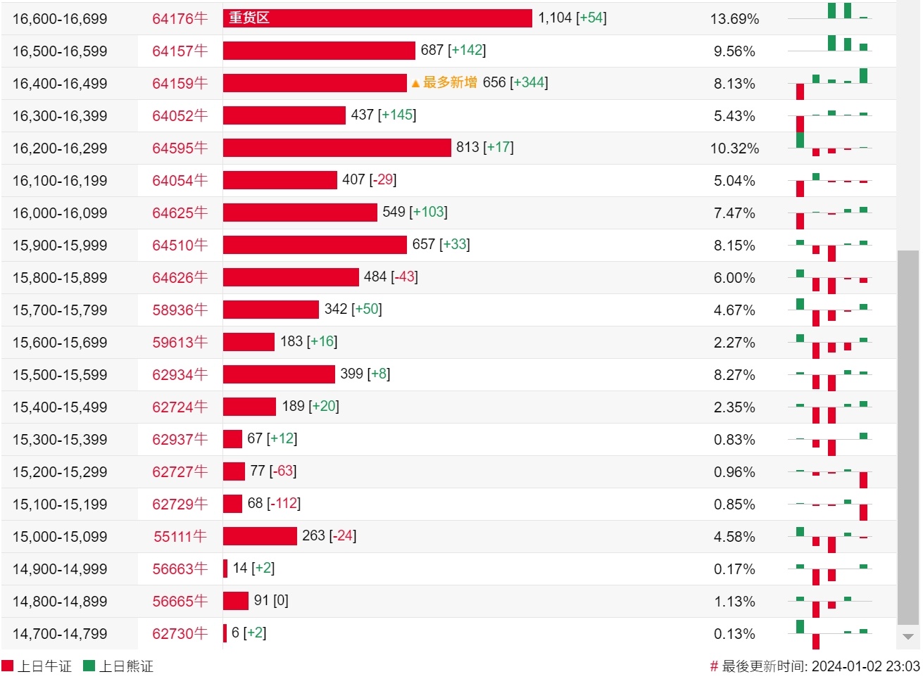 牛证街货重货区在16600-16699区间,该区间最新牛证数量为1104张,较上一交易日增加54张;最多新增在16400-16499区间,该区间最新牛证数量为656张,较上一交易日增加344张。