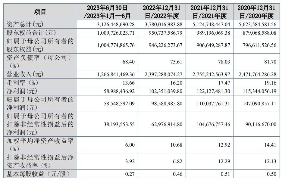 财务方面,于2020年度、2021年度、2022年度以及2023年1-6月,公司实现营业收入分别约为24.72亿元、27.55亿元、23.97亿元以及12.67亿元;同期,归属于母公司所有者的净利润分别约为1.07亿元、1.10亿元、9858.90万元以及5854.86万元人民币。