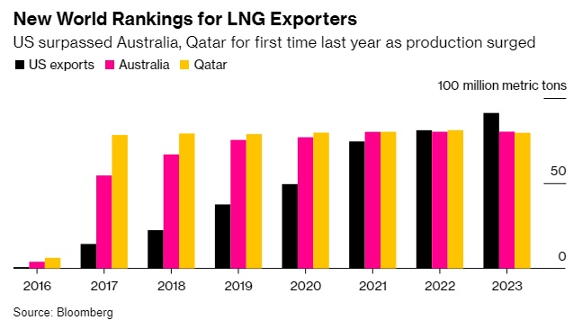 智通财经APP获悉,美国首次成为全球最大的液化天然气出口国,2023年的出货量超过了主要供应国澳大利亚和卡塔尔。