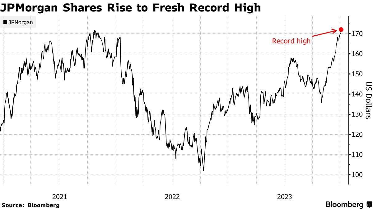 智通财经APP获悉,摩根大通(JPM.US)股价首次在两年多时间内创下新高。截至周一收盘,该股收涨1.2%,至172.08美元,超过了2021年10月设定的之前最高记录。据了解,这家总部位于纽约的银行作为该行业的佼佼者,去年公布了创纪录的业绩,促使其首席执行官杰米·戴蒙警告说银行在某些领域“盈利过剩”。