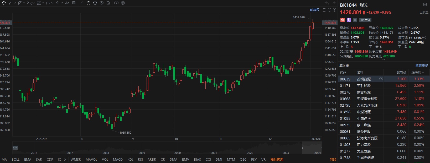 智通财经APP获悉,1月3日,煤炭股延续昨日开门红的涨势,截至收盘,首钢资源(00639)涨3.33%、兖矿能源(01171)涨2.59%、中国神华(01088)涨0.55%,值得一提的是,中国神华A股收涨1.85%,AH股均继续刷新15年来的股价记录。期市方面,焦煤期货主力合约今日继续走高,截至收盘涨3.08%,报1973元/吨,而前日收盘涨2.44%。国泰君安表示,煤价震荡有支撑,值得重视的是煤炭板块在业绩有保障叠加高股息下配置价值凸显。