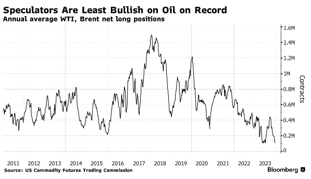 目前,多个指标都显示出疲软态势。在12月的大部分时间内,布伦特期货曲线都处于看跌的溢价结构中,近期合约的交易价格低于远期合约。2023年的投机者对该商品的看跌程度为十多年来最高。根据彭博社汇编数据,非商业参与者在主要原油合约上平均持有的净多头头寸已创下自2011年以来最低记录。