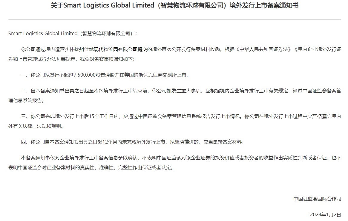 智通财经APP获悉,1月3日,中国证监会发布关于《关于Smart Logistics Global Limited(智慧物流环球有限公司)境外发行上市备案通知书》。该公司通过境内运营实体抚州佳斌现代物流园有限公司提交的境外发行上市备案材料已获中国证监会接收,公司拟发行不超过7500000股普通股并在美国纳斯达克证券交易所上市。