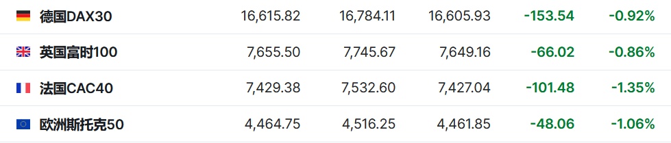 2.截至发稿,德国DAX指数跌0.92%,英国富时100指数跌0.86%,法国CAC40指数跌1.35%,欧洲斯托克50指数跌1.06%。