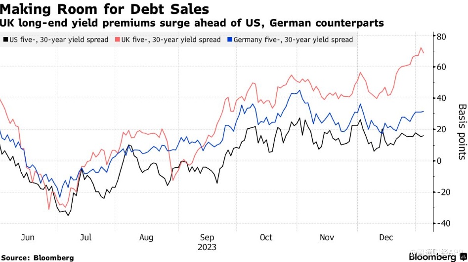 智通财经APP获悉,英国长期国债是受全球债券市场低迷打击最严重的债券之一,投资者正在为本月晚些时候的一系列英国国债发售做准备。在今年头两个交易日,30年期英国国债收益率上升了14个基点,高于美国和德国国债收益率。5年期英国国债与30年期国债的收益率之差升至近一年半以来的最高水平。