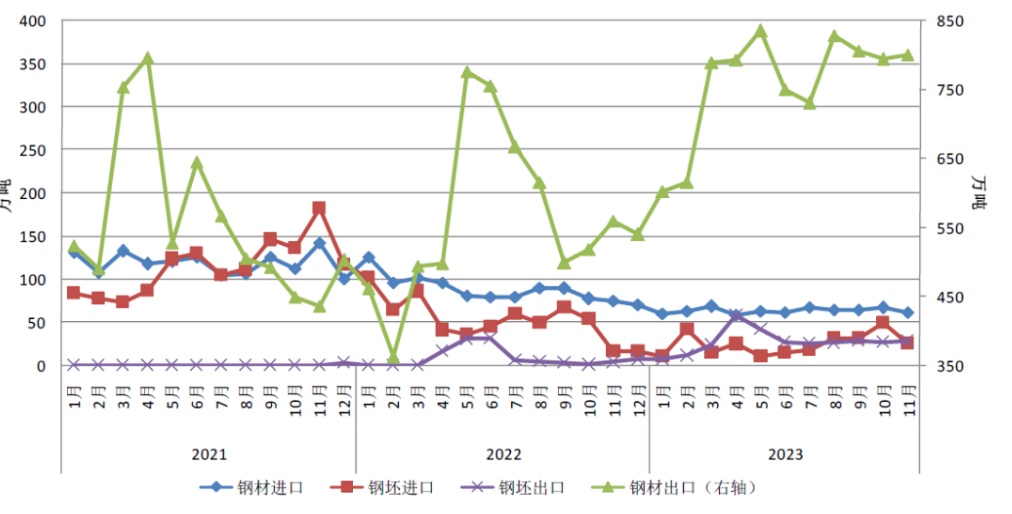 11月,全球钢价普遍上行,国内钢价由降转升,同时因人民币汇率攀升,中国钢材出口报价提涨,但在全球市场仍处于偏低水平,出口价格优势犹存。预计2023年我国钢材出口量超9000万吨,历史上仅低于2014-2016年出口规模,进口量约760万吨。需要注意的是,因出口规模扩大,2023年全球已有5个国家对华钢铁产品发起了6起贸易救济调查,年末墨西哥宣布对华部分钢铁产品征收近80%进口关税,钢企需警惕贸易摩擦加剧风险。此外,2023年12月28日税则委发布公示调整5个钢铁产品税则子目,为推动钢铁产品进出口精准施策奠定了良好基础。