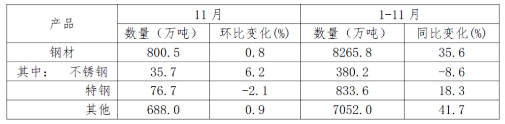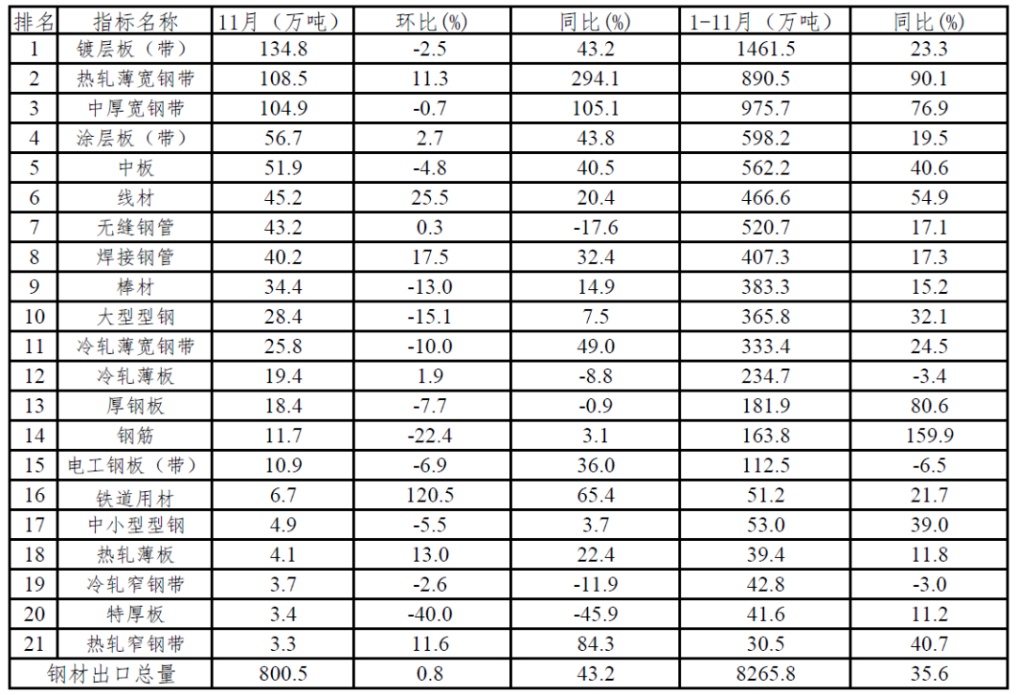 11月,我国出口钢材800.5万吨,环比增长6.6万吨,同比增长241.5万吨;出口平均单价810.9美元/吨,环比上涨2.4%,同比下跌38.4%。1-11月,出口钢材8265.8万吨,同比增长35.6%;出口平均单价947.4美元/吨,同比下跌32.2%;出口钢坯301.6万吨,同比增长205.6万吨;粗钢净出口7960.2万吨,同比增长3099.3万吨,增幅63.8%。