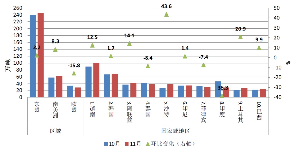 11月,我国对东盟出口钢材244.9万吨,环比增长2.2%,占出口总量30.6%,增量主要来自越南,环比增长12.5%至100.6万吨。出口增幅较大的是沙特,环比增长43.6%至38.0万吨。对印度出口环比下降38.3%,自上月历史高位回归至正常水平。