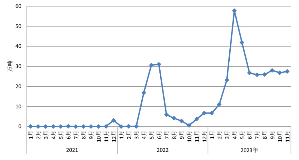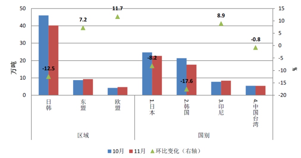 11月,我国进口减量全部来自日本、韩国,环比分别下降8.2%和17.6%。自东盟进口9.3万吨,环比增长7.2%,其中印尼进口量环比增长8.9%至8.4万吨。