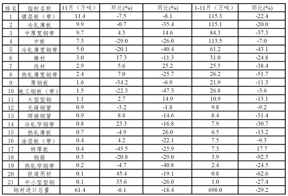 11月,我国钢材进口环比回落,保持低位运行。进口减量主要来自中板和冷轧薄宽钢带,来自日本、韩国的进口均有所下降。具体情况如下: