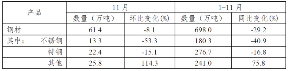 表2 2023年11月不锈钢及特钢出口情况