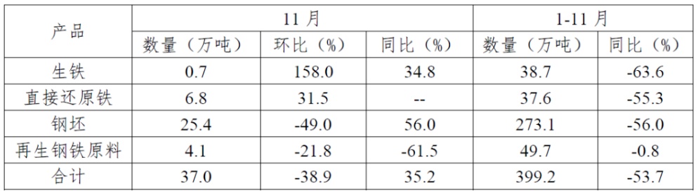 11月,我国进口初级钢铁产品(包括钢坯、生铁、直接还原铁、再生钢铁原料)37.0万吨,环比减少38.9%;其中钢坯进口量环比减少49.0%至25.4万吨。