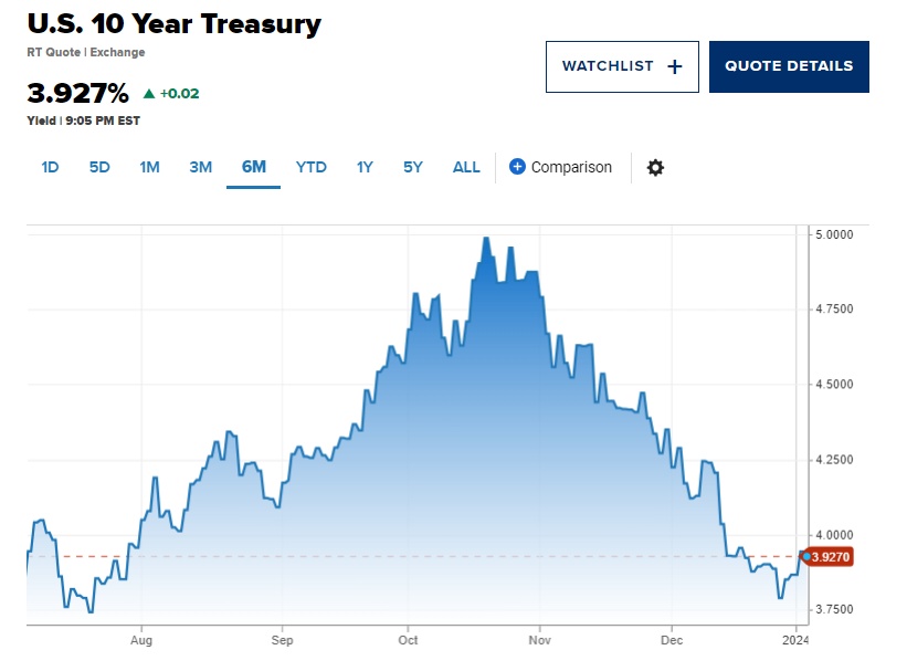 智通财经APP获悉,有着“全球资产定价之锚”称号的10年期美国国债收益率在2024年第二个交易日短暂突破4%重要关口,此后小幅回落至3.9%附近。美联储票委突然发表鹰派言论以及12月会议纪要难以撑起大幅降息150个基点的热切期待,投资者们对于美联储降息预期似乎明显降温,普遍押注美联储今年可能不会像预期的那样大幅降息。