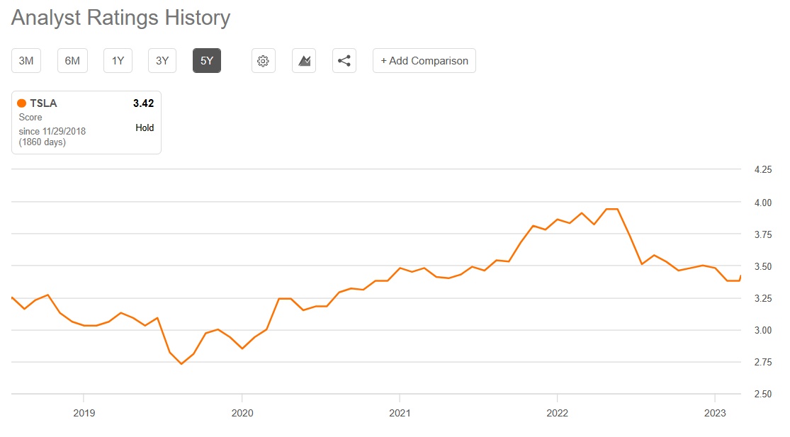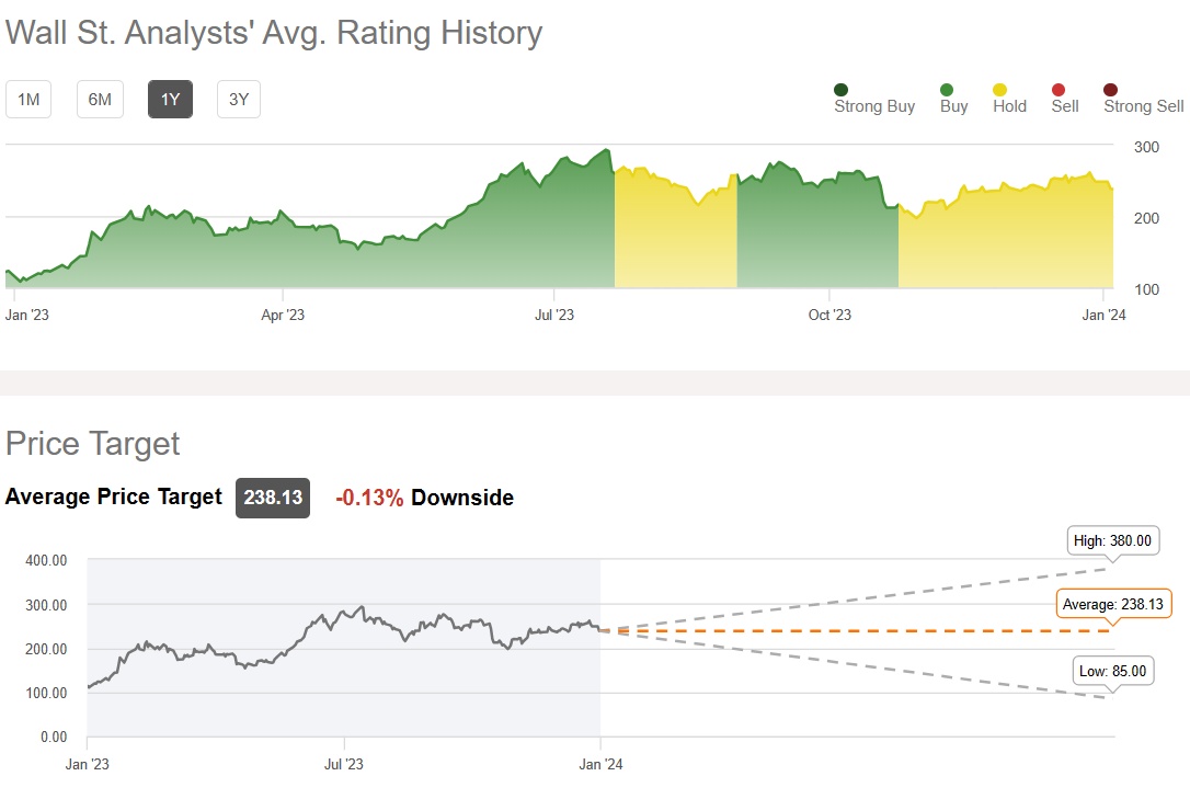 股票评级和股价目标价预期方面, Seeking Alpha汇编的预期数据显示,华尔街分析师们予以特斯拉的共识评级已经由此前的“买入”转变为“持有”,平均目标价仅仅达238.13美元,意味着未来12个月潜在下行空间达0.13%,最低目标价则仅仅为85美元。