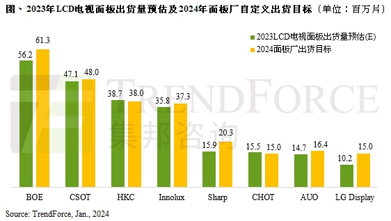 夏普(Sharp)除广州43吋因受惠订单转移,国际品牌客户对其需求也有所增长。日本Gen10堺(Sakai)工厂在2023年下旬开始加入32吋单切产品,2024年也将加入32吋及65吋混切产品,以改善该厂产品竞争力,因此在出货目标设定较为积极,约2,030万片。