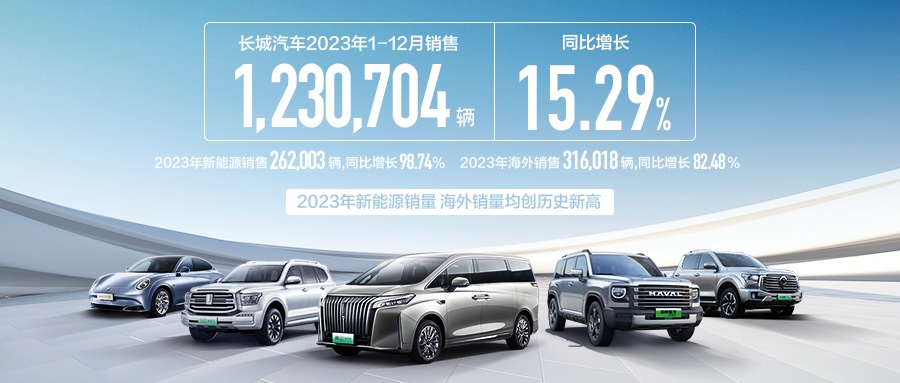 2023年1-12月,长城汽车累计销售1,230,704辆,同比增长15.29%。其中,海外累计销售316,018辆,同比增长82.48%,创历史新高!随着更多全球化战略车型成功出海,截至目前,长城汽车海外销量已超140万辆。2023年全年,长城汽车新能源销量翻倍!累计销售262,003辆,同比增长98.74%。
