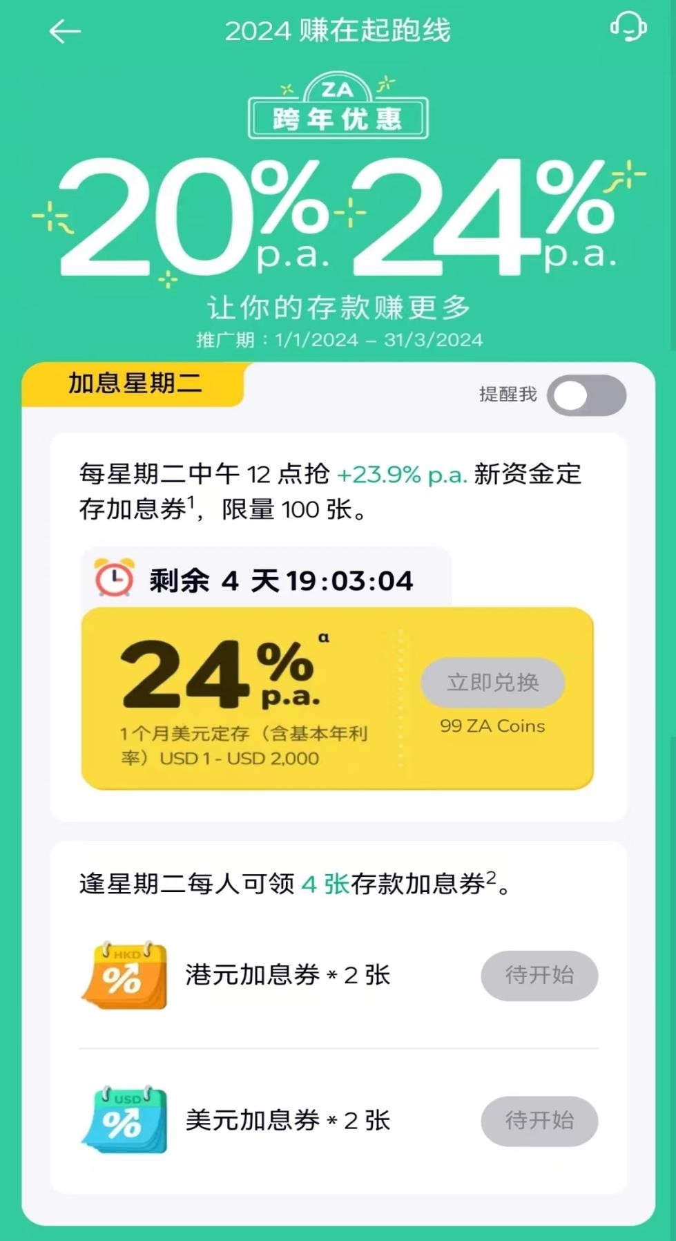 智通财经APP获悉,众安银行近期推出一项跨年优惠活动“2024赚在起跑线”,每周二中午12点,个人用户可上线抢购加息券,加息券利率高达23.9%,加上基础利率,年化收益最高可达24%。值得一提的是,用户每周二都有机会领取2张港元加息券和2张美元加息券,意味着无论存款是港元还是美元,都能享受这一福利。
