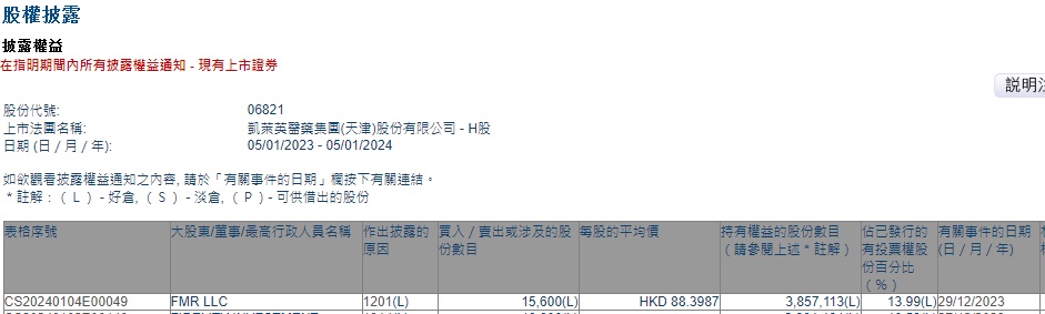 LLC减持凯莱英(06821)1.56万股,每股作价88.3987港元,总金额约为137.90万港元。减持后最新持股数目约为385.71万股,最新持股比例为13.99%。