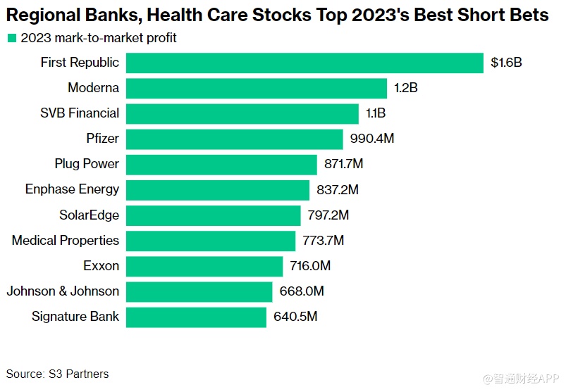 根据S3 Partners LLC的数据,第一共和银行(FRCB.US)的倒闭使该股成为2023年最赚钱的看跌押注,账面利润达16亿美元。在2023年暴跌了45%的疫苗生产商Moderna(MRNA.US)位居第二,为押注股票下跌的空头赚取了12亿美元。
