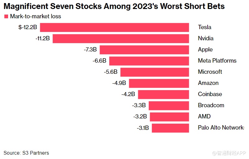 特斯拉(TSLA.US)空头的损失最为惨重,这家电动汽车制造商的股价在2023年几乎翻了一番,导致空头的账面损失达122亿美元。其次是英伟达(NVDA.US),该公司令空头损失112亿美元,紧随其后的是所谓的“七巨头”、半导体公司和加密货币交易平台Coinbase(COIN.US)。
