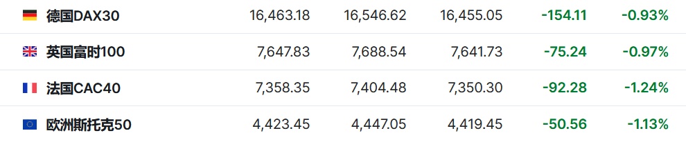 2.截至发稿,德国DAX指数跌0.93%,英国富时100指数跌0.97%,法国CAC40指数跌1.24%,欧洲斯托克50指数跌1.13%。