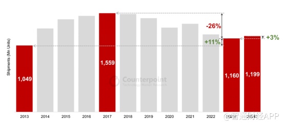 TrendForce集邦咨询亦指出,第三季度全球智能手机总产量约3.08亿部,环比增长13%,虽不及疫情前水平,但相较2022年同期增长约6.4%,终结连续八个季度的年衰退周期。据其预测,电商促销、年终购物旺季等激励因子叠加智能手机品牌年末冲刺生产数量的惯性,第四季度智能手机总产量有机会再环比增长 5~10%,2023年全年总产量约为11.6亿部。
