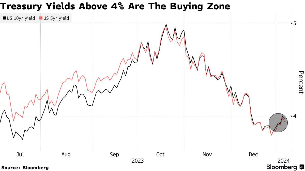 债券市场在2023年最后两个月的反弹使其结束了数十年来最严重的下跌,并推动了交易员对债券将在2024年上涨、且债券收益率不会重新测试之前峰值的押注。虽然投资者注意到,如果即将公布的数据可能会改变对美联储潜在利率路径的预期,收益率可能会走高,但一些大型投资公司一直将债券近期的下跌视为买入的好时机。