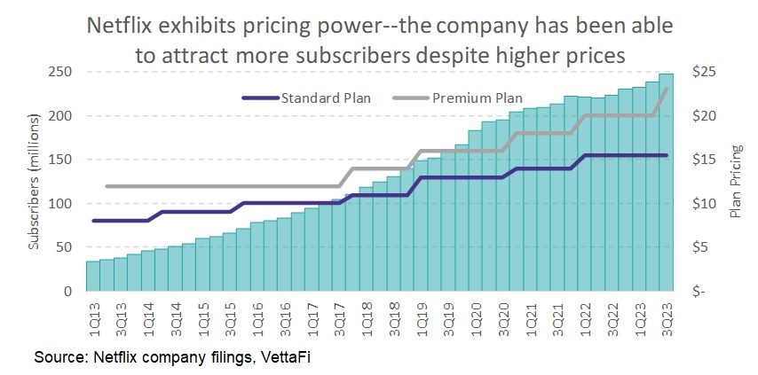 在此基础上,他们可以提高价格——奈飞在过去几年里曾多次这样做——以维持高水平的收入增长。这就是定价权。