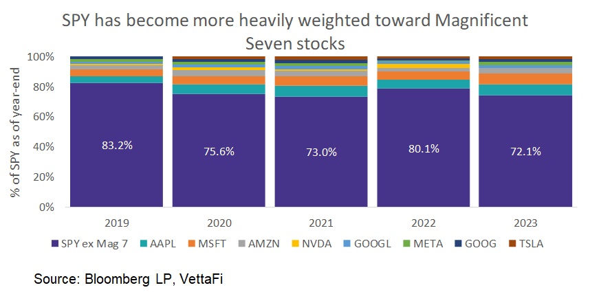 标准普尔500指数去年上涨了24%。这在很大程度上是由苹果(AAPL.US)、微软(MSFT.US)、特斯拉、亚马逊(AMZN.US)、英伟达(NVDA.US)、Meta平台(META.US)和Alphabet(GOOGL.US)等股票推动的。