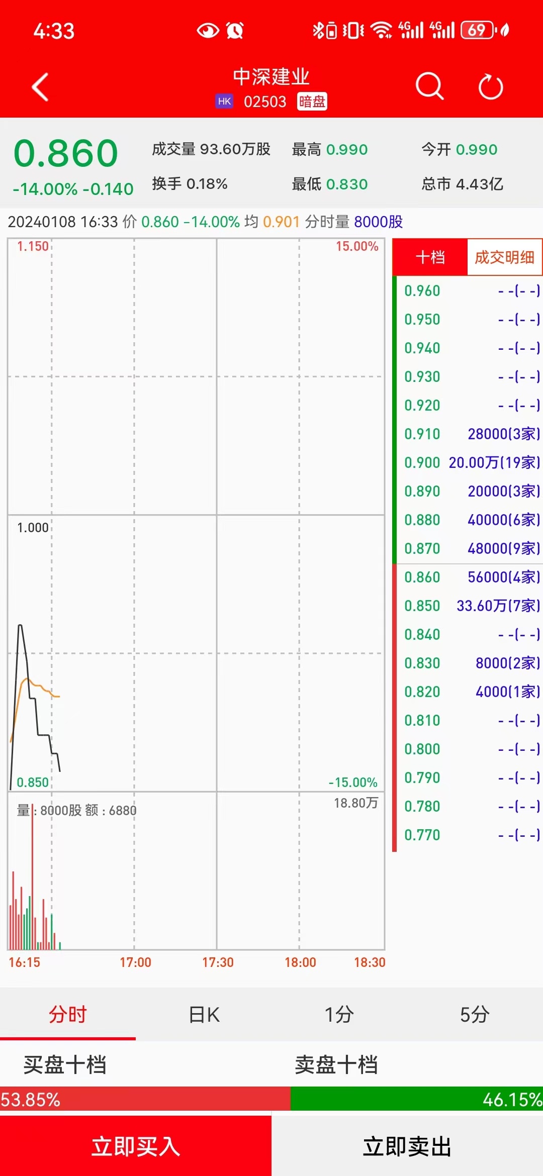 智通财经APP获悉,中深建业(02503)将于1月9日(周二)在香港挂牌。截至发稿,利弗莫尔证券暗盘交易显示报价0.86港元,较招股价1.00港元下跌14%。每手4000股,不计手续费,每手亏560港元。