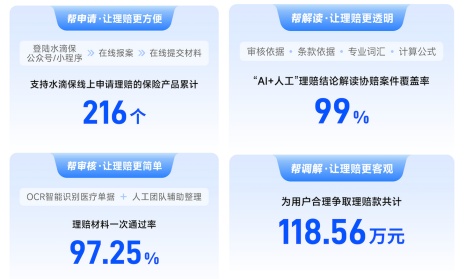 在科技金融、数字金融方向指引下,水滴保依托自身大数据的AI能力的优势,将保险科技应用到理赔环节,极大地提升了理赔效率。年报数据显示,相较2022年“帮帮赔”全流程平均提效36.75%,简易案件平均结案时效降至2.3小时,理赔材料一次通过率达97.25%,助力保司提效24.92%。