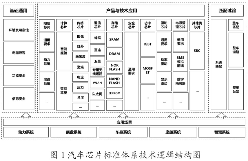 汽车芯片标准体系基于汽车芯片技术结构,适应我国汽车芯片技术产业现状及发展趋势,形成从汽车芯片应用场景需求出发,以汽车芯片通用要求为基础、各类汽车芯片应用技术条件为核心、汽车芯片系统及整车匹配试验为闭环的汽车芯片标准体系技术逻辑结构。以“汽车芯片应用场景”为出发点和立足点,包括动力系统、底盘系统、车身系统、座舱系统及智驾系统五个方面,向上延伸形成基于应用场景需求的汽车芯片各项技术规范及试验方法。