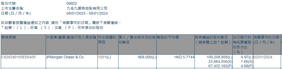 智通财经APP获悉,香港联交所最新资料显示,1月2日,小摩减持九毛九(09922)86.8万股,每股作价5.7744港元,总金额约为501.22万港元。减持后最新持股数目约为1.00亿股,最新持股比例为6.97%。