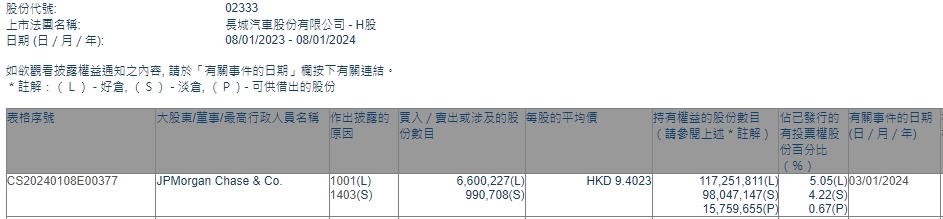 智通财经APP获悉,香港联交所最新资料显示,1月3日,小摩增持长城汽车(02333)660.0227万股,每股作价9.4023港元,总金额约为6205.73万港元。增持后最新持股数目约为1.17亿股,最新持股比例为5.05%。