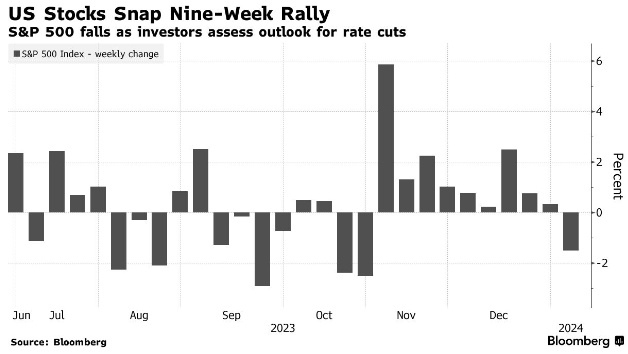 标普500指数在2024年开局不利,结束了长达9周的涨势,原因是交易员对美国降息时机和规模的乐观情绪有所消退。Wilson去年大部分时间甚至在股市反弹时都看空股市,他预计,对经济看法的转变将在今年全年推动股市“波折”。
