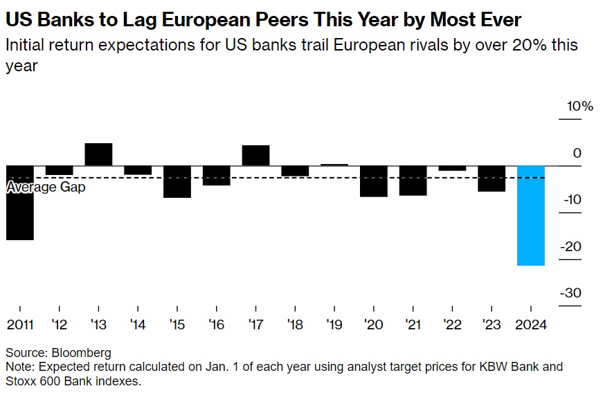 因此,根据各大投资机构分析师的普遍预期数据,2024年全年欧洲银行股的整体投资回报率预期高达22%,而美国银行业同期整体投资回报可能将与上一年几乎持平,信贷担忧令美国银行业股价大幅承压,而欧洲银行则被分析师们视为廉价的低估值银行股。21个百分点的预期投资回报率差距如果成真,这至少是自2005年彭博开始记录银行股回报率差值以来最大的差距水平,与此同时美国各大商业银行正准备从本周开始发布第四季度财报。