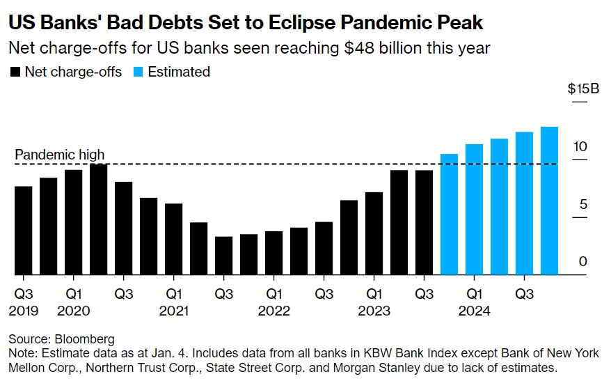 美国银行业的坏账规模可能将超过疫情峰值——美国银行业今年的净冲销额预计将达到480亿美元