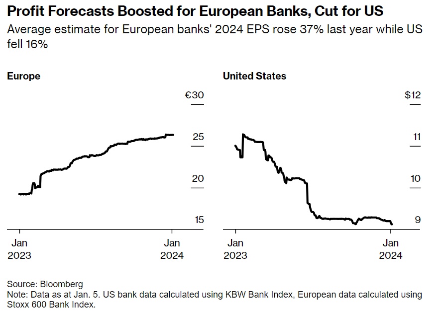 欧洲银行业的整体利润预期被上调,美国银行业的利润预期惨遭大幅下调——欧洲银行股2024年每股收益平均预期较去年上升了37%,而美国银行业预期则下降了16%