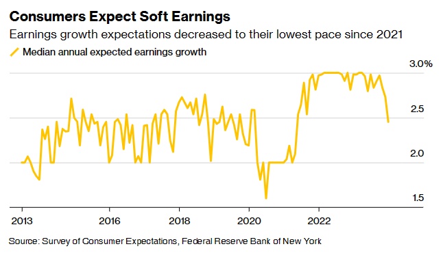 美国消费者预计未来一年收入增长也将放缓。纽约联储表示,这种放缓是由高中或更低学历的受访者推动的,年收入低于5万美元的受访者预计收入增长1%,而年收入在10万美元以上的受访者预计收入增长3%。