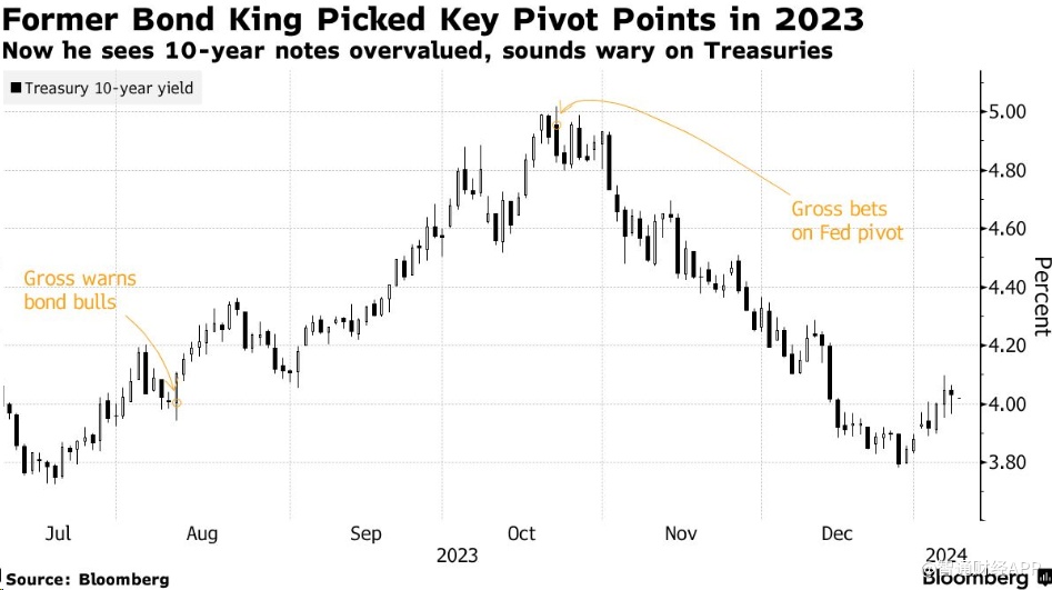格罗斯在2023年准确预测了美国国债市场的关键拐点。去年年底,格罗斯押注美联储将在2024年转向降息,并从强劲的债券上涨中获利数百万美元。他曾在去年8月份警告称,债券多头被误导了,两个月后债市暴跌将收益率推至16年高点。