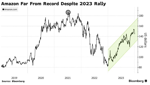 在美股七巨头(标准普尔500指数市值最大的七只股票)中,亚马逊是最久未创下历史纪录的公司了,相比之下,苹果、微软(MSFT.US)和英伟达去年都已创下了新高。美股七巨头中的谷歌(GOOG.US)母公司Alphabet、特斯拉(TSLA.US)和Facebook母公司Meta(META.US)在去年推动市场走强之后,1月份大多表现不佳。